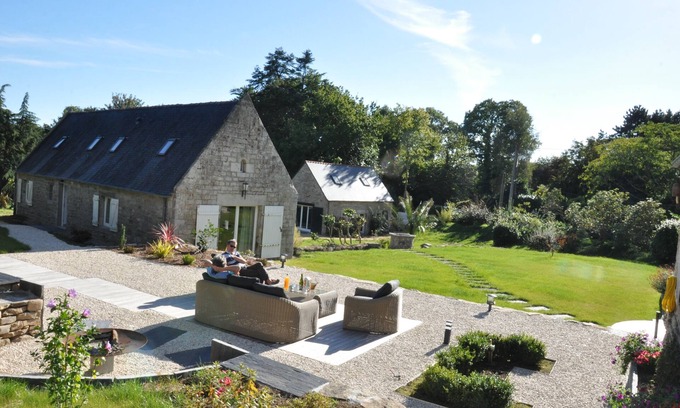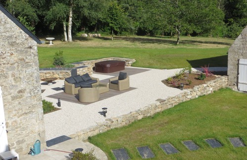 19th century farmhouse on a large green plot 50 m from the Odet. A house is composed of a living room, kitchen, a bedroom and two bathrooms. A second house accommodates four other bedrooms and two bathrooms. A converted barn accommodates a bedroom with shower and a games or reception room. Adjoining terrace for lunch outside in fine weather. Absolute calm. Large terrace with jacuzzi and brazier.