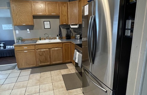 Our Kitchen is stocked with basics for your stay. It includes: A farmhouse style cast iron sink, brand new stainless steel appliances - refrigerator, cooking stove/oven and over the range microwave. We also provide a Keurig coffee maker, 4 slice toaster, Ninja blender, pots, pans, eating utensils, cups and plates.