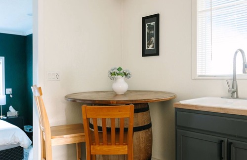 Step inside our thoughtfully designed studio unit, complete with a full kitchen, cozy bedroom, and two comfortable sitting chairs. The space exudes a rustic farmhouse ambiance, boasting brand new butcher block countertops, stylish kitchen appliances, and inviting wood floors. Delight in the charming details such as the wine barrel dining table, porcelain sink, and warm wood accents, creating an atmosphere that feels both nostalgic and welcoming.