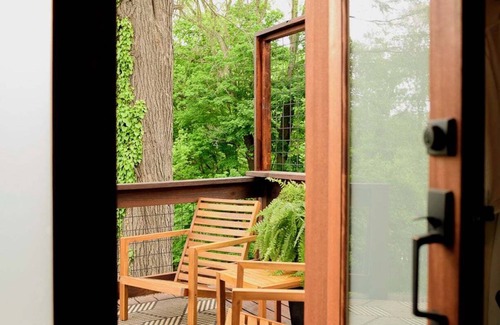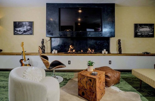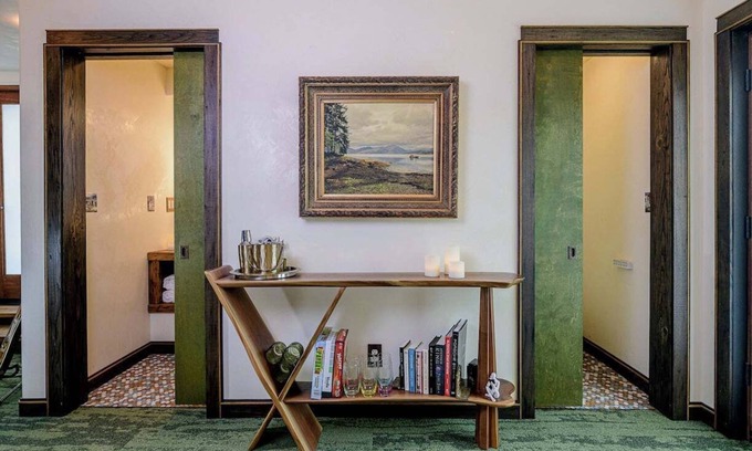 Every detail of The Farmhouse Suite has been thoughtfully curated using reclaimed, eco-friendly materials. Indulge in the spacious rainfall Tadelakt shower or enjoy the handcrafted marble sink from Spain, complemented by a French Designed Dragon Head Faucet. Set the perfect ambiance with customizable mood lighting and relax by the 48-inch bio-fuel fireplace. For entertainment, unwind with a Sonos Spatial audio speaker and a 75-inch TV, or savor the view from your private patio with a covered awning. Coffee lovers will appreciate the Nespresso, Keurig, and traditional coffee maker, complete with pods and free snacks. Plus, a tankless water heater ensures you never run out of hot water.
