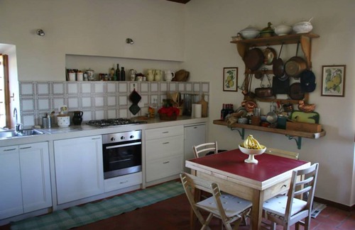 The decor, simple and rustic, wants to preserve the nature of the place: the tile floors, doors, windows and furniture are made of wood, the ceilings have exposed wooden beams. The kitchen is very large, has a dining table where you can eat in the sixth. The bedrooms are two, one double and a triple with a single bed and a half and a loft with two single beds, both with views of the olive, the bathroom has a shower and a wooden ceiling; Finally, the living room is very large and consists of living room and dining room, with fireplace, table for 10 people and has a ceiling of wooden beams.