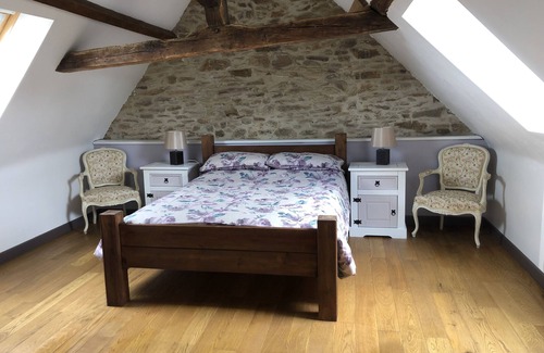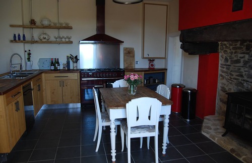 Situated in 56 acres of our own meadows and woodland. The farmhouse is set within a large private courtyard. The 200yr old stone built farmhouse is equipped with a modern touch while not losing that traditional French feel. The kitchen is hand made from using local chestnut timber, there is a six burner gas hob and double oven rangemaster cooker so the self catering can be much for enjoyable and stress free with the amount of people in your party. There is a four seater table in front of the log burner in the kitchen area for those early risers or late evenings chatting in front of the log fire. There is also a large solid oak dinning table which comfortably seats 8 people.
