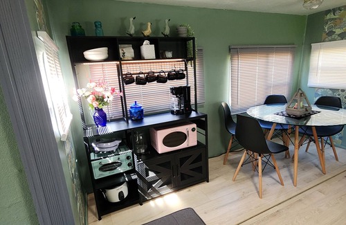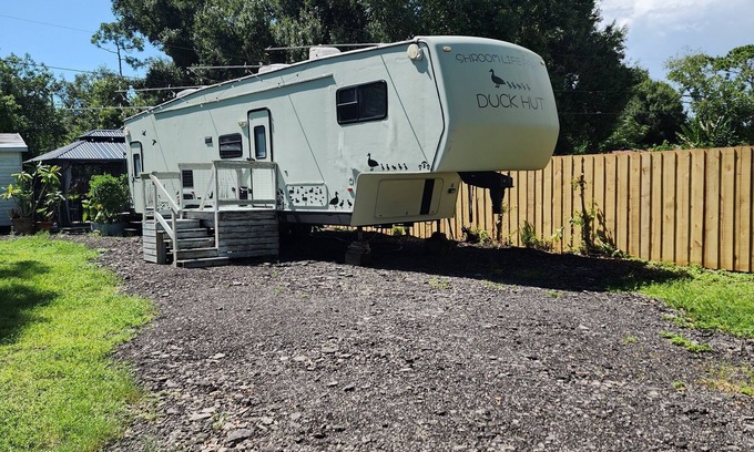 The duck hut is 1 of 2 vacation rental campers located on Shroom life farm. Guests may enjoy the screened in covered gazebo living/dining space in the back of the Duck hut with a table and couch area. perfect to lounge and enjoy the sounds of the farm. There are patio lights that come on at dusk plus fun colorful led strips and remote control to dim, change colors or turn off. You will hear crowing in the distance (and they crow randomly all hours of the day and night) plus the sounds of ducks, chickens, quail and local wildlife. Lots of local wildlife and birds also visit property even peacocks! There is not access to the barn or backyard where the animals are but I am happy to arrange time to get them to come over to where you can see them thru the fence and feed them plus answer any questions about farm life. I love talking about the chickens and ducks! Please remember there is no smoking inside the Duck hut however I have an ashtray in the covered area for you to use if you are a smoker. Please do not litter cigarettes in the yard or driveway. They are poisonous to my animals.