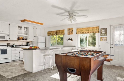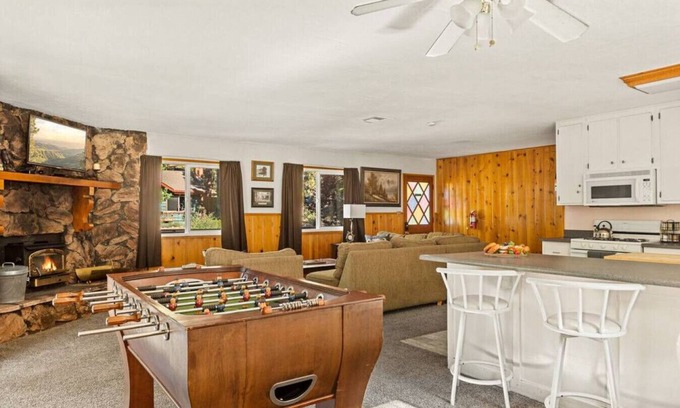 Living Room: Features a wood burning fireplace, Roku, Apple TV, DVD player and DVDs. Foosball table. Open floor plan.