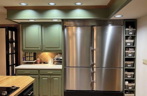 The second upstairs master has a king bed, two twin beds, and a comfortable chaise lounge, and another full bathroom with double vanities and a steam shower, and a staircase that leads directly into the sauna room/swimming pool area. Our guests describe the house as “an amazing architectural wonder“ and “a beautiful blend of luxury and homeyness!“