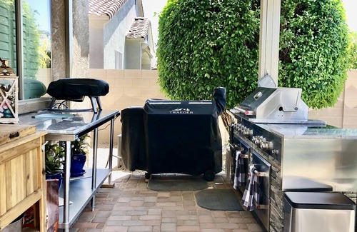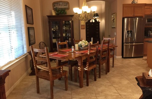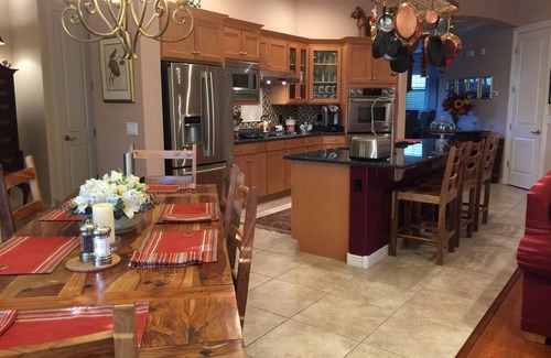 Thank you for considering our home for your holiday. Our one story home is 3500 SF has a front living room with pool table and an office. There is a family room/kitchen combination with an informal dining table. There is a large 20 by 40 foot heated pool with diving board, Day to day heating included. Two days prior to arrival there is a separate $200 pool heat up fee. (Cost per night for unheated pool $450, additional heating pool fee is our cost to heat pool) A separate 6 person hot tub, a pergola with table and chairs, two chaise lounges, a furnished back porch and a covered kitchen patio with Traeger and gas grill for your enjoyment. Robes, slippers, highend towels and USB ports in each bedroom are just a few of the extras provided to make your stay a special luxurious time. No Pets