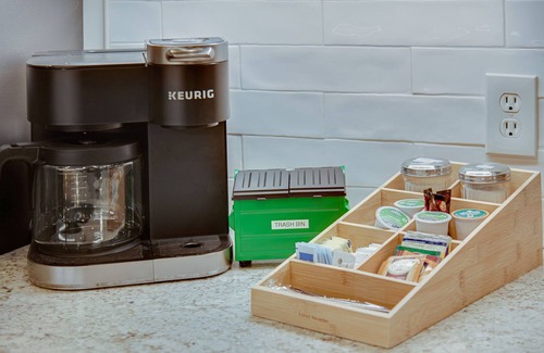 The remodeled kitchen is an oasis with beautifully designed custom granite countertops, custom Sage Green cabinets, state-of-the-art stainless steel refrigerator, dishwasher, stove & oven, and oversize sink. Full tile backsplash with custom over-stove art is highlighted with undercabinet lighting. Cooking is a dream using the electric cooktop/oven with range hood, powerful microwave, oversize stainless sink and super-quiet garbage disposal. Enjoy the extensive equipment: serving ware, cookware, utensils, and numerous small appliances. The stocked Keurig coffee station lets you choose between brewing individual K-cups OR full carafes. Start your morning by choosing from a selection of coffees and a bevy of condiments. Tea lovers also have an electric kettle and a selection of black and herbal (non-caffeinated) tea bags.