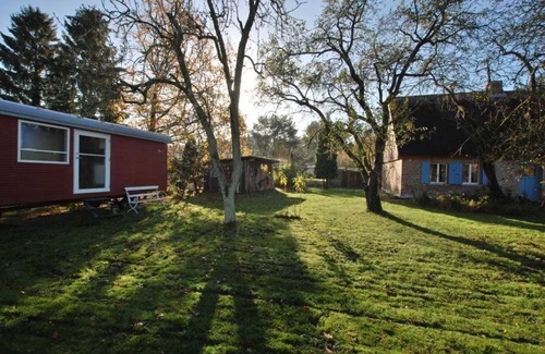 In addition to the house we can offer you a Swedish red trailer as accommodation for 1-2 people. The car is completely renovated and stands in the garden under old fruit trees. On 14 sqm you will find all the comforts: a double bed (160x200), a kitchenette with fridge, kettle, double stove top and a small bathroom with shower and toilet. You can book the trailer together with our house, then they have a total of space for up to 8 adults. The twilight and the stove also allow overnight stays during the transitional periods, a separate booking in advance. and low season is possible on request.