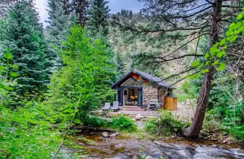 Cozy and stylish waterfront cabin surrounded by lush forestry, and stunning mountain views. Lounge and relax by the gorgeous creek just off of the back patio. Beautiful studio cabin with heated floors throughout, and a large bathroom. Perfect for a single traveler or a romantic haven for two. The cabin is just 20 mins from the ski slopes, 35 mins from Denver and only 5 minutes from the historic town of Idaho Springs.