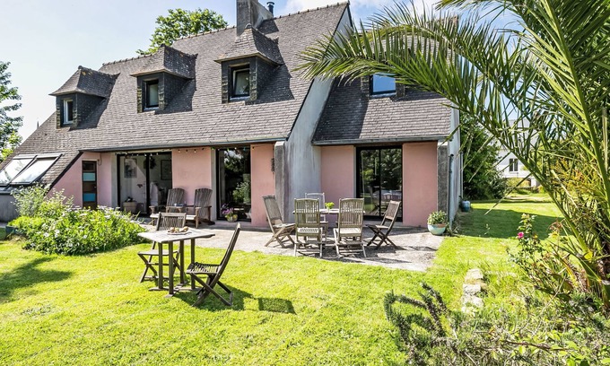 "Feliz Breizh", 5-room house 120 m2 on 2 levels. Spacious, beautiful and cosy furnishings: open living/dining room 30 m2 with digital TV and flat screen. Exit to the garden, to the terrace. 1 room 15 m2 with 1 french bed (140 cm, length 200 cm), bathroom. Open kitchen (oven, dishwasher, 4 gas rings, toaster, kettle, microwave, freezer, electric coffee machine) with dining table. Sep. WC. Upper floor: 2 rooms 14 m2, with sloping ceilings, each room with 1 french bed (140 cm, length 190 cm). Living/sleeping room 14 m2, with sloping ceilings with 1 sofabed (140 cm, length 200 cm). Bathroom, sep. WC. Electric heating, wood heating. Large terrace 40 m2, south facing position. Terrace furniture. Facilities: washing machine. Internet (WiFi, free). Please note: non-smoking house. Maximum 1 pet/ dog allowed. Smoke alarm. Offer by a private individual according to Art. 155, IV of CGI. 29206 000048 2P
