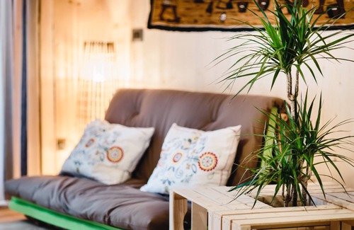 Larch scent - and the forest view pampers your mood. Now you can finally let go of your thoughts. And being there together. Embedded in natural quality. The interior design in NONO2 is a fine experiment: upcycling furniture meets African art accents. Your four-legged companion is also welcome in NONO2!