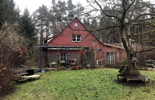 Our property is located in the south of the district town of Roth in a secluded location in the middle of the forest, but still very close to the city center, shops, triathlon area. Bus stop 500m away. The Brombachseeradweg leads directly, long-distance cycle paths nearby. The property is 6000sqm in size with a small fish pond, campfire area, keeping chickens, fruit trees.