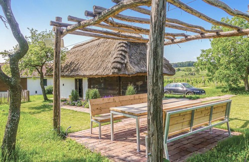 This charming holiday home will delight you with its authentic exterior, which is characterised by the thatched roof typical of the region. Inside, a surprisingly modern and comfortable ambience awaits you. The open bedroom under the thatched roof, accessible via a ladder, promises romantic hours. Two comfortable sofa beds on the ground floor offer you additional space for relaxing nights. The lovingly crafted bed linen in traditional blue print reflects the successful combination of tradition and modernity. You can prepare breakfast with regional delicacies in the small, cosy kitchen, while the wine arbour in the idyllic garden invites you to linger and enjoy a glass of wine.
