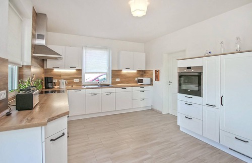 The approx. 129 m², disabled-friendly, non-smoking house with underfloor heating has a large living room (upholstered furniture, flat-screen TV, wood-burning stove, dining table, desk) with open-plan kitchen (induction hob, oven, fridge, freezer, dishwasher, microwave, various small kitchen appliances), two bedrooms (2 single beds each, 1 can be joined together, 1 x TV), a large bathroom (2 washbasins, walk-in shower, WC, hairdryer) and a spacious hallway.