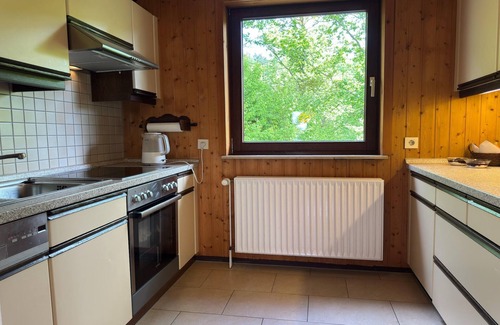 The spacious and renovated holiday home impresses with its generous amenities on two floors and 110 square meters. The quiet location of the house, built on the hillside, is ideal for recharging your batteries. From the large, covered balcony on the first floor and the second, uncovered balcony on the second floor, as well as several terraces, you have an idyllic view over the forested property. From here, you can enjoy the magnificent view of the Eder Valley and the 673-meter-high "Sackpfeife" mountain. Hatzfeld is located in the typical low mountain landscape of the Upper Eder Valley. The highest peaks here rise to 674 meters (Sackpfeife). You can discover charming vistas in all seasons. For example, pass the time on a canoe trip or fishing. The town and the neighboring Waldeck-Frankenberg district offer visitors numerous leisure activities. Highlights included: Wi-Fi, consumption-based energy costs, final cleaning, firewood Activities nearby: The Hessian Bergenland region offers a variety of leisure activities in both summer and winter. The beautiful landscape is ideal for hiking or Nordic walking tours. The trails are very well marked and have received awards from the German Hiking Institute. The Ederauen Cycle Path (200 km) runs directly through the town, just 1 km away, and Sackpfeife with its summer toboggan run is just eight kilometers away. The Eder Dam and Waldeck Castle, 60 kilometers away, as well as Bad Berleburg, Marburg, and Frankenberg, are also worth a visit. The renowned winter sports resort of Winterberg also has a lot to offer.
