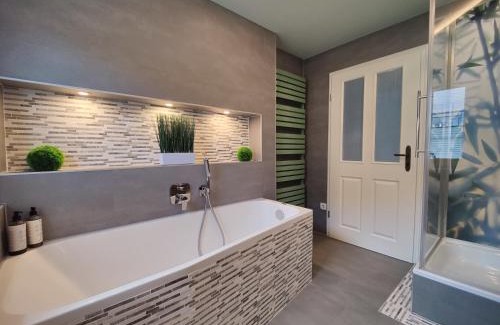 Ferienhaus Villa Adelsberg mit Dachterrasse in Zentraler Lage für bis zu 10 Personen is a recently renovated villa in Chemnitz where guests can make the most of the garden and bar. This property offers access to a terrace and free private parking. The accommodation offers a 24-hour front desk and luggage storage space for guests. With free Wifi, this 5-bedroom villa provides a satellite flat-screen TV and a kitchen with a dishwasher and oven. A private entrance leads guests into the villa, where they can enjoy some wine or champagne and chocolates or cookies. There's also a seating area and a fireplace. Playhouse Chemnitz is 2 miles from the villa, while Karl Marx Monument is 2.5 miles away. Dresden Airport is 48 miles from the property.