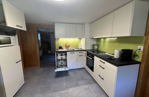 80 m2. More information by the provider: Freshly renovated and sunny 3-room apartment (80m2) on the second floor of a two-family house. The apartment is in a quiet location in the countryside, but close to the village of Frutigen. Living room with satellite TV, WLAN and sitting area. Fully equipped, new kitchen with oven, kettle, dishwasher, coffee machine, fridge with freezer compartment. One bedroom with double bed, one bedroom with three single beds (5 beds in total). One bathroom with shower/WC. Balcony with unobstructed view of the mountains. Garden seating area with gas barbecue. Two parking spaces available. Pets not allowed. Non-smoking apartment.