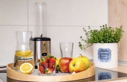 There is also a hand mixer and a smoothie maker. The kitchen is equipped with high-quality, brand-name dishes, 4 different pots, and a frying pan.