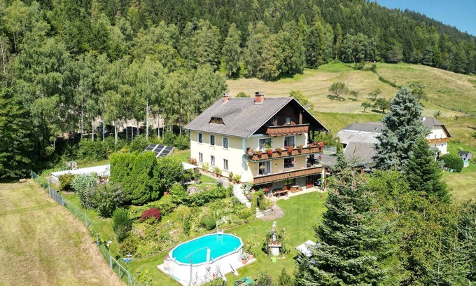 Magdalensberg 20 km from Klagenfurt: Large single-family house "Ferienwohnungen Magdalensberg", 800 m a.s.l 3 storeys, renovated. In a sunny, elevated position, along the wooded area. For shared use: large, well-kept garden, lawn for sunbathing, pond, swimming pool (above ground) (seasonal availability: 01.May. - 30.Sep.). Table tennis, patio, garden furniture, barbecue. In the house: WiFi, storage room for bicycles, storage room for skis, washing machine, tumble dryer (for shared use, extra). Airport transfer. Roofed, parking on the premises. Supermarket 5 km, restaurant 4 km, bus stop "Magdalensberg Abzw Ottmanach" 850 m, indoor swimming pool 9 km. Golf course (18 hole) 20 km, riding stable 3 km, mountain railway 45 km. Nearby attractions: Archäologiepark Magdalensberg 3 km, Burg Hochosterwitz 13 km. Well-known ski regions can easily be reached: Gerlitzen 50 km, Petzen 45 km. Well-known lakes can easily be reached: Längsee 18 km, Klopeiner See 25 km, Wörthersee 23 km. Hiking paths: Marienpilgerweg, Vierbergeweg. Please note: car recommended, no lift. The owner lives in the same residence. Wellness and leisure activities within 15 km. Awarded 4 Edelweiss by the Carinthian Hospitality Association in 2018.