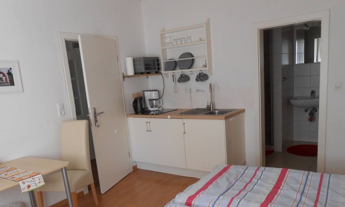 Unsere Ferienwohnung mit 18m2 Wohnfläche im Erdgeschoss bietet Platz für 1-2 Personen. Das gemütliche Wohnzimmer mit Satelliten-TV lädt zum Verweilen ein. Die kleine Küchenzeile mit 2 Herdplatten, Kaffeemaschine, Wasserkocher und Kühlschrank/Spüle lässt keine Wünsche offen. Die Ferienwohnung verfügt über ein Schlafzimmer mit zwei Einzelbetten. Das separate Badezimmer mit Dusche, WC und Fön rundet das Gesamtbild ab. Bitte beachten Sie, dass Haustiere nur auf Anfrage erlaubt sind. Das WLAN können Sie kostenfrei nutzen. Im überdachten Hof können Sie den Abend entspannt ausklingen lassen. Diese Wohnung kann auch als Doppelzimmer genutzt werden. Frühstück kann beim Bäcker gleich um die Ecke eingenommen werden.