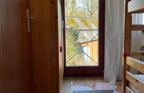 A highlight of our vacation apartment "Nils Holgerson" are the two private balconies. One balcony is equipped with a table and two chairs. From the balconies the view opens into the garden of the vacation home. Behind them are horse paddocks, forests and a hilly landscape behind which the golden reeds and the sea can already be guessed. In the evening the wind rustles through the leaves of the many trees, bushes and shrubs that surround the cottage. The balconies are partially embedded in the roof truss of the cottage, which provides a pleasant weather and privacy protection. The garden has a swing and can be shared by the guests of our vacation home. In addition, the vacation home has its own parking space.