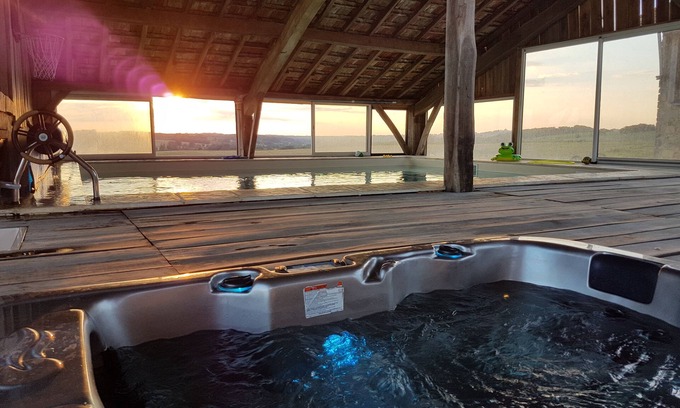 the relaxation area with its spa and heated heated swimming pool with its oak terrace of the farm very beautiful view of the sunset.