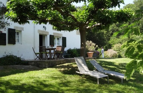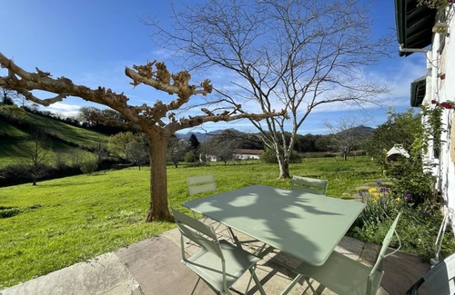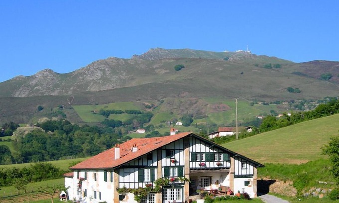 Lodging in the owner's house with guest rooms, on the ground floor of an old 15th century Basque farmhouse located at the foot of La Rhune. American kitchen (microwave, induction hob), living room (counter table, fridge-freezer)), lounge area, 2 bedrooms (1 double bed. 2 single beds), bathroom, wc. Central heating extra. Possibility to rent sheets, towels and cleaning fee. Possibility of Internet access (Wifi). Private terrace, garden furniture, barbecue, large unfenced common ground. The owner also speaks Basque.