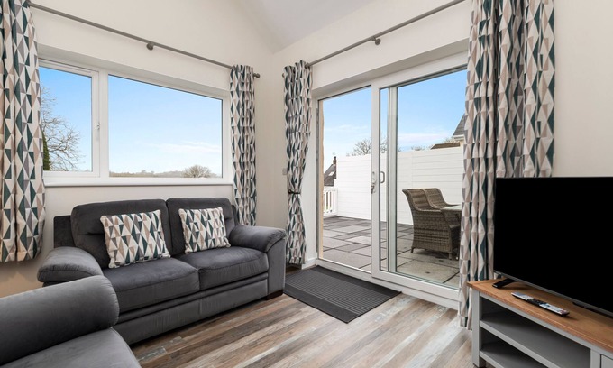 Comfy sofas, nest of side tables and TV, the perfect place to relax and watch your favourite shows after a day exploring or enjoying the beach. French doors open out on to a small, decked area.