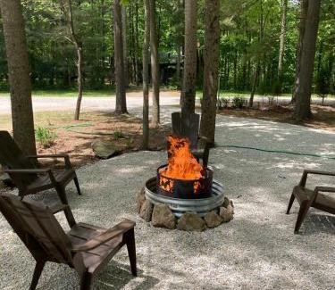 - Charming cabin that has beds for 8 guests, many parking spaces, cozy fire pit
