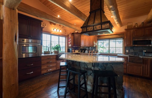 You'll never want to leave the Great Room with its 25' ceiling, huge log trestle, rustic decor, comfortable leather couches with built-in recliners, and 60 inch flat screen Smart TV with satellite service and Blu-ray player. The room has three levels of lighting: ambient ceiling lights for TV viewing, fan lights for socializing, and reading lamps for, well, reading. It also has a massive real river rock gas fireplace for chilly evenings.