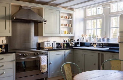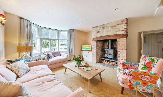 Fern House is a wonderful Grade II cottage, which has been lovingly furnished and styled to provide a comfortable and stylish holiday home for up to four guests. On entering the property there is a bright hallway which leads through to a beautiful sitting room with its large brick fireplace and wood burning stove, high ceilings and shuttered bay window. The well stocked games cupboard will provide plenty of amusement for cosy evenings by the fire. Gorgeous pink sofas invite you to take a seat and relax, and enjoy the special atmosphere of this unique cottage, which cleverly combines its character features with well chosen furnishings and contemporary touches.