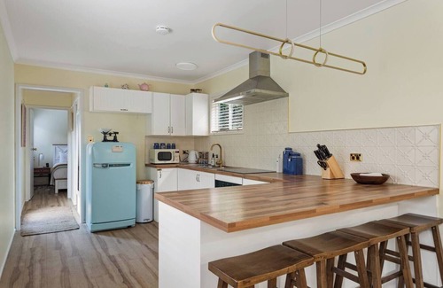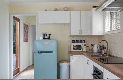 This dreamy cottage will reconnect you with nature as each outlook highlights towering treetops and mountainside sounds. Newly renovated, you can enjoy a nature holiday without sacrificing the creature comforts of home. The living room features a chaise lounge, wall-mounted TV, air conditioning and a selection of books. The office is set up for remote work with Wi-Fi, an ergonomic chair and a monitor. The kitchen has a cute retro style while boasting contemporary appliances such as an induction stove and range hood, oven and pastel blue fridge. A wooden bench wraps around the kitchen providing ample room for meal prep and doubles as a casual dining space with four wooden stools.