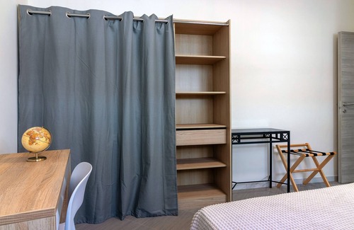 • A double bedroom with a visible wardrobe, veiled by a curtain suggesting stories and guarding secrets.