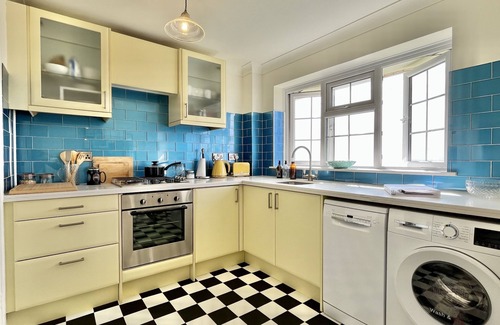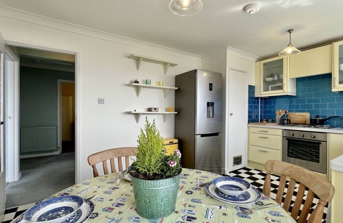 Set on the first (top) floor of a smart set of apartments, the large sitting room and kitchen-diner both face south to the sea with fantastic long range views. The sitting room offers plenty of seating and large Smart TV, and the kitchen-diner is a bright and colourful place to cook and dine. The spacious master bedroom offers a king size (5’) bed, sofa, wardrobe and drawers, while Bedroom Two offers twin beds (two singles), a wardrobe, drawers and a desk.