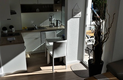 Very stylish and with great attention to detail, this apartment was equipped and furnished. Everything was custom-made to measure. Beautiful living on a compact surface, perfectly used. A small entrance area with built-in wardrobe will take you to the gorgeous apartment. Right on the left is the tasteful shower room. Then you get into the living-dining area with a sleeping alcove in which there are two separate beds. The massive and tasteful fitted kitchen is also a highlight. A door leads to the sunny south-west balcony, which is already equipped with table and chairs.