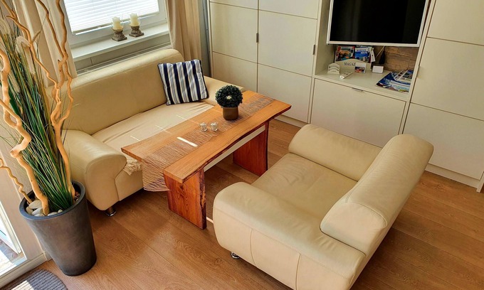 The stylish features of the apartment 'Sea-Lounge' sets in terms of interior, high standards in a relaxed lounge atmosphere. Modern comfort combined with oak wood and the charm of maritime cosiness create the perfect setting for an inspiring stay in the largest city on the German North Sea coast.