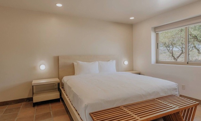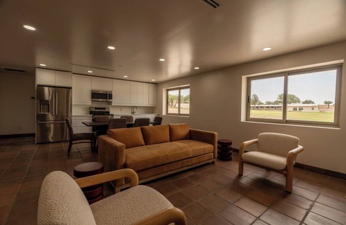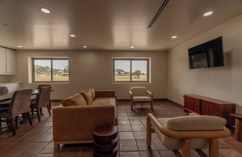 Surrounding an expansive lawn known as "The Field," this unit offers a well-appointed king and queen-size beds, private bath, spacious living room, full kitchen, and outdoor seating area. Immerse yourself in refined comfort as desert light and landscape complement the modern styling. Experience the air, light, and colors of the mountain desert, expansive outdoor areas, and the brilliant night skies of Chihuahuan Desert sky islands, evoking the spirit of the American West.