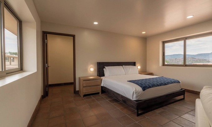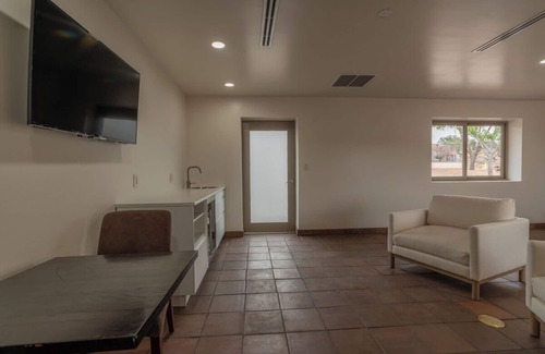 Surrounding an expansive lawn known as "The Field," this unit offers a well-appointed king and queen-size beds, private bath, original fireplace, spacious living room, full kitchen, and outdoor seating area. Immerse yourself in refined comfort as desert light and landscape complement the modern styling. Experience the air, light, and colors of the mountain desert, expansive outdoor areas, and the brilliant night skies of Chihuahuan Desert sky islands, evoking the spirit of the American West.