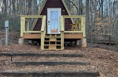 Unit 20 is a cozy, adorable A-frame tucked back in the woods, featuring a queen sized bed perfect for 2 people. Heat & AC, luxury bedding, coffee maker, outdoor seating, private outdoor fire pit.