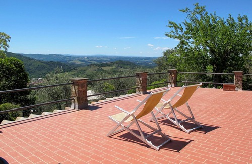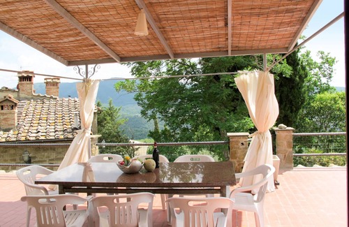 "Fienile", 5-room semi-detached house 110 m2 on 2 levels. Spacious, rustic and antique furnishings: large living/dining room with open-hearth fireplace, dining table and satellite TV. Exit to the terrace. 2 double bedrooms. Small kitchen (2 hot plates, oven, dishwasher, 4 gas rings, toaster, kettle, microwave, electric coffee machine). Exit to the balcony. Shower/bidet/WC. Upper floor: 1 double bedroom. 1 room with 2 beds (80 cm). Shower/bidet/WC. Heating (extra). Natural stone floors. Balcony, large terrace 40 m2 partly roofed. Terrace furniture, balcony furniture, barbecue. Marvellous panoramic view of Chianti. Facilities: children's high chair, baby cot for up to 2 year olds, hair dryer. Parking (2 cars) at the house. Please note: suitable for families. Non-smokers only. Maximum 2 pets/ dogs allowed. Private entrance. IT048021B5HUDSPMZM