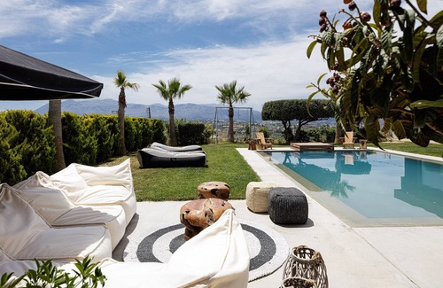 Rising from the ground in a statement of architectural glory, this lavish villa is the ultimate luxury pad for your dream family gathering. Designed with film set scenery in mind & with surreal art this unique home has it all ! Be whisked away into a world of utter extravagance at this flamboyant large one acre retreat in secluded Agios Georgios, only a few minutes drive from Heraklion lively center. Award wining for its design & settled within poetic scenery this is a dream holiday choice that you & your loved ones won’t ever want to leave. The House fuses inspirational exteriors with a back-to-nature setting, providing the sanctuary you crave for a together-time retreat. From summer days spent lounging by the pool to atmospheric evenings huddled around the outdoor dinning area, this luxury self-catering home in Crete was designed with the ultimate care by the homeowner, as he is an interior designer. With plenty of space for the whole family to unfurl in, here is a home where loved ones ( can host up to 12 guests) can set themselves free.