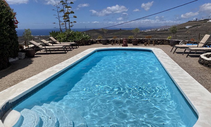 Amazing 200 years old finca refurbished to the actual size and comfort. Situated in one of the best places in Lanzarote, with a view of the sea and the sea. Big private terrace with a 10m swimming pool and large solarium to sun bath. All day sun !! The swimming pool is only for adults and swimmers, free solar heated, thermic cover and also electrically heated on request (at extra charge) Beautiful and wide Canarian garden. The house has an entrance porch with wooden roof and an old bread oven. A big separate kitchen, a huge dinning room with a high wood ceiling, a separate and spacious living room with great sea views and a terrace overlooking the swimming pool and Fuerteventura. One master bedroom with a king bed and ensuite shower room with sea views from the bed. Two other bedrooms with large private patio overlooking the patio, one with a queen bed and the third bedroom with two single beds. One big family bathroom. Outside gas kitchen with BBQ grill and plancha. Space, calm, privacy, comfort, charm and beauty. Needs a car rental. Free Wifi and free Netflix.