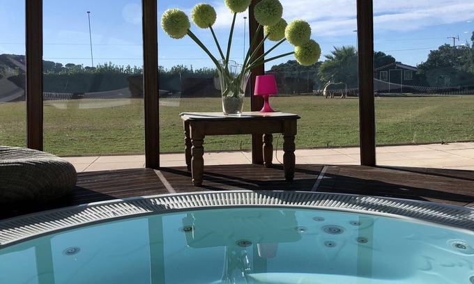 The amenities at Finca Montnegre Suites and Spa are designed for comfort and relaxation. Your stay includes five exquisitely decorated double rooms, spacious lounges perfect for gatherings, and two fully equipped kitchens ideal for hosting meals. Outside, you will find a charming outdoor porch, BBQ space, and a large swimming pool with a built-in jacuzzi—perfect for unwinding after a day of festivities. The wellness area offers additional luxurious pampering options such as an indoor jacuzzi and sauna, available upon request.