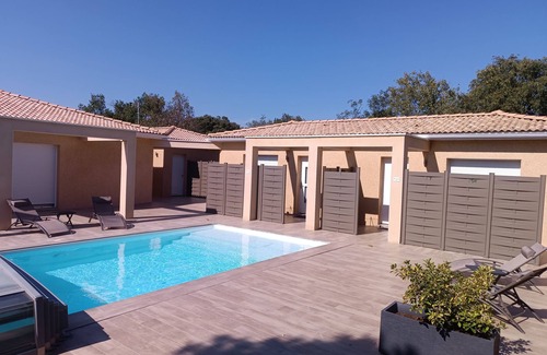 Shared pool for 2 apartments. Unheated, covered (telescopic cover), ideal temperature from mid-season, 8 x 4 meters, integrated staircase and two-seater deck, tiled deck, sunbeds provided, on the edge of the forest.
