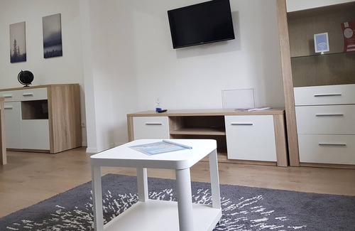 It has two bedrooms, one double and the other with two beds, the living room has a dining table, flat TV, Wi-fi and cable channels.