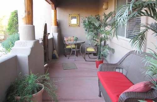 Casita has a 1 car garage and large open area parking. From outside the garage, walking to the right under the arch you walk alongside the garage wall (covered with lush green plants growing to its roof-line) and have your first look to the west at our full Sonoran Desert. Past the garage, to the left, you enter through the two low Mexican wooden gates onto the north portion of our three sided private Casita patio.