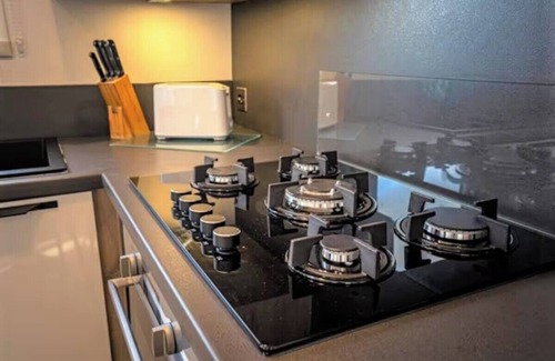 The kitchen has a fridge, a hob, an oven, a toaster, a kettle, a coffee maker, a freezer and a microwave.
