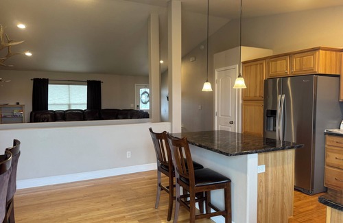 Bring the whole family to this great place with lots of room for fun. Located just minutes from two lakes and town, this rancher-style, 3 bedroom, 2 bathroom home has main level living and features a full kitchen with granite countertops and stainless-steel appliances. A pack-n-play and high chair are available for your convenience. Additional amenities include soft water, air conditioning, and a reverse osmosis water system. Also, enjoy summer nights on the large patio in the backyard.