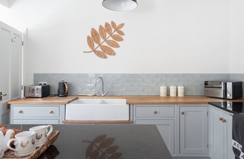 The house features a fully fitted kitchen with top quality amenities including a DeLonghi coffee bean machine and a large cast-iron Aga stove. There are two other conventional ovens available as well and the kitchen is well stocked with all the amenities required for a self-catering stay. On the downstairs floor, is the utility room which has a doggy door which is the perfect place for the pets to stay. The utility room also houses the washing machine and dryer.