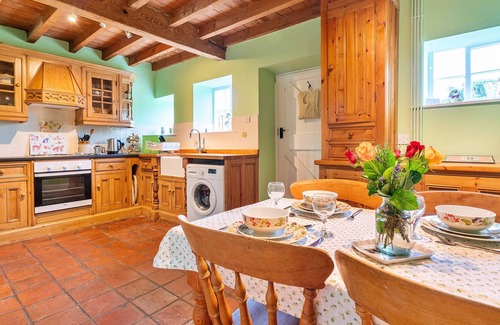 Guests can enjoy a fully equipped kitchen with custom-made pine units, a Belfast sink, electric oven with hob, washing machine, fridge freezer, and microwave. Adjacent to the kitchen is a dining area that can comfortably accommodate four people.